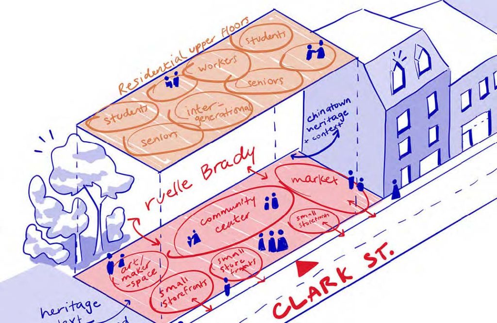 透過開放日和兩個設計研討會,我們匯集了唐人街的各種利益相關者和專業知識,包括居民、商人, 工人, 社區組織者, 市政府官員和非營利住房部門成員。這些會議使人們能夠集體反思克拉克街的整體未來,並確定了市政府擁有的土地上的混合用途住房項目對實現這一願景的潛在貢獻。