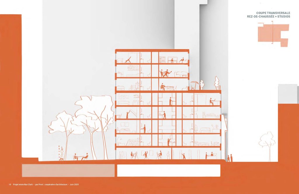 該專案是一項社區主導的計畫,旨在為市政府擁有的地塊制定多用途住宅專案概念計畫。基於對克拉克街未來的整體願景,該概念規劃旨在滿足社區的多樣化需求,並促進該社區所需的變化。Pivot: Coopérative d’Architecture 從兩個合作設計工作坊中收集到的社區見解,為該住宅專案創建了一個提案。